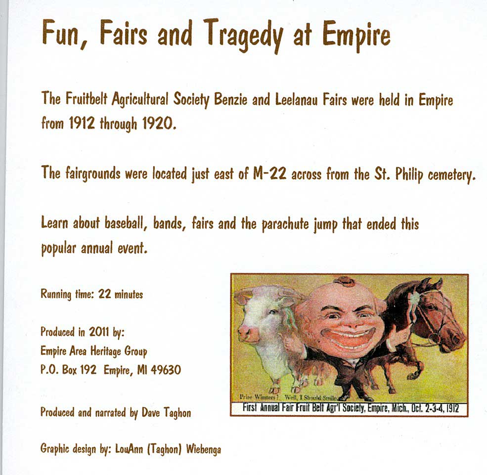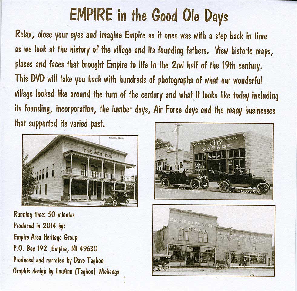 Here is our current selection of videos available in the museum gift shop. Click on the image to enlarge the picture to learn what each video is about. All of our videos are reasonably priced at only $8.00 (add $3.00 postage for the 1st item or $5.00 for 2 or more items) and you can order by calling our museum when we are open at (231) 326-5568 or simply send a check with a note telling us what video you want to Empire Museum, PO Box 192, Empire, MI 49630