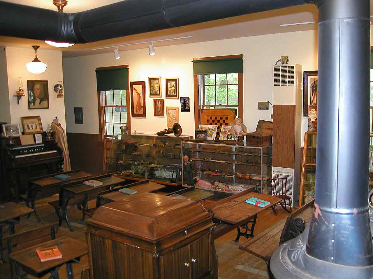 The Schoolhouse is nestled in the woods behind the main museum building. This one-room structure was also once used as a church. It includes an old organ, a woodburning stove and an outdoor water pump and outhouse.